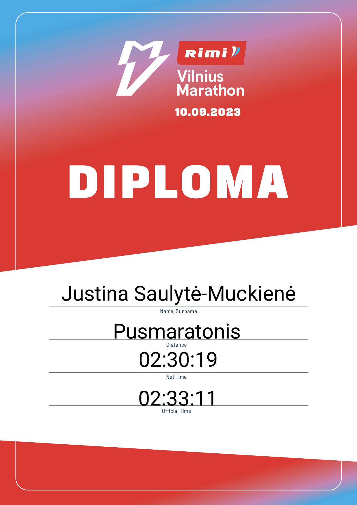 | 1631 | Justina Saulytė-Muckienė | SEB | 12897 | Lithuania | Pusmaratonis | 02:33:11 | Diplomas |