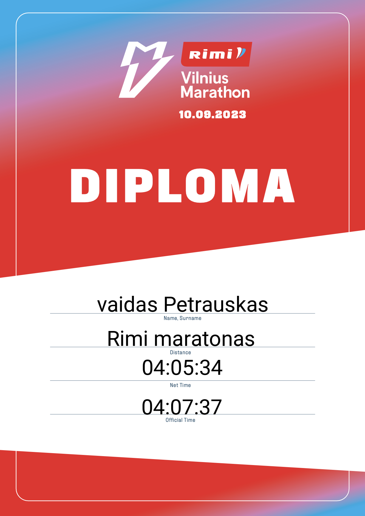| 332 | Vaidas Jazdauskas | VGTU Turistų klubas | 337 | Lithuania | Rimi maratonas | 03:52:05 | Diplomas |