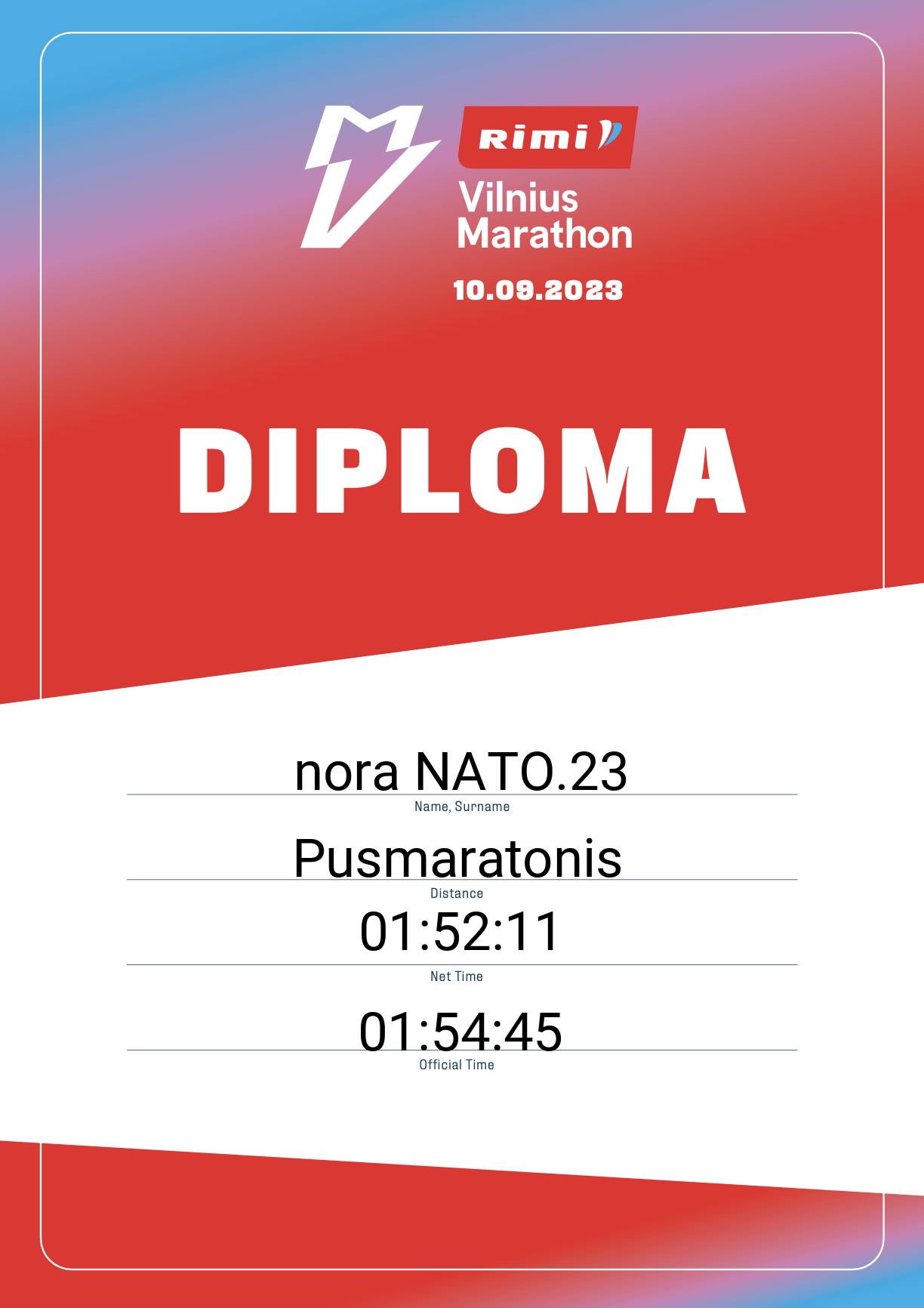 | 706 | nora NATO.23 | NATO | 13330 | Norway | Pusmaratonis | 01:54:45 | Diplomas |