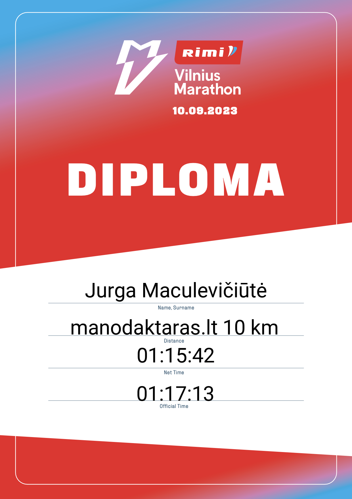 | 1906 | Jurga Maculevičiūtė | 20075 | Lithuania | manodaktaras.lt 10 km | 01:17:13 | Diplomas | |