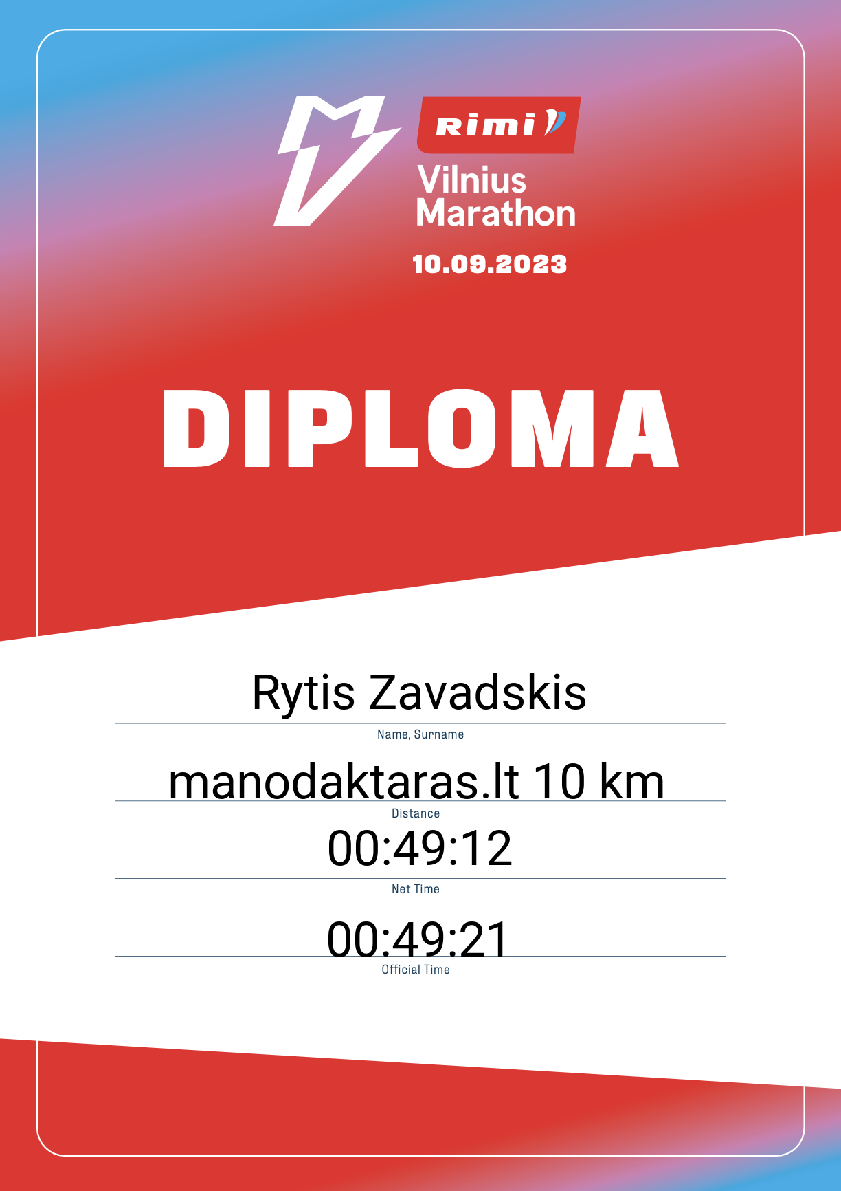 | 224 | Rytis Zavadskis | 20140 | Lithuania | manodaktaras.lt 10 km | 00:49:21 | Diplomas |