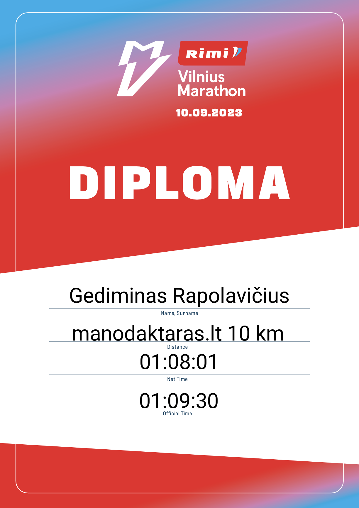 | 1658 | Gediminas Rapolavičius | 20312 | Lithuania | manodaktaras.lt 10 km | 01:09:30 | Diplomas | |