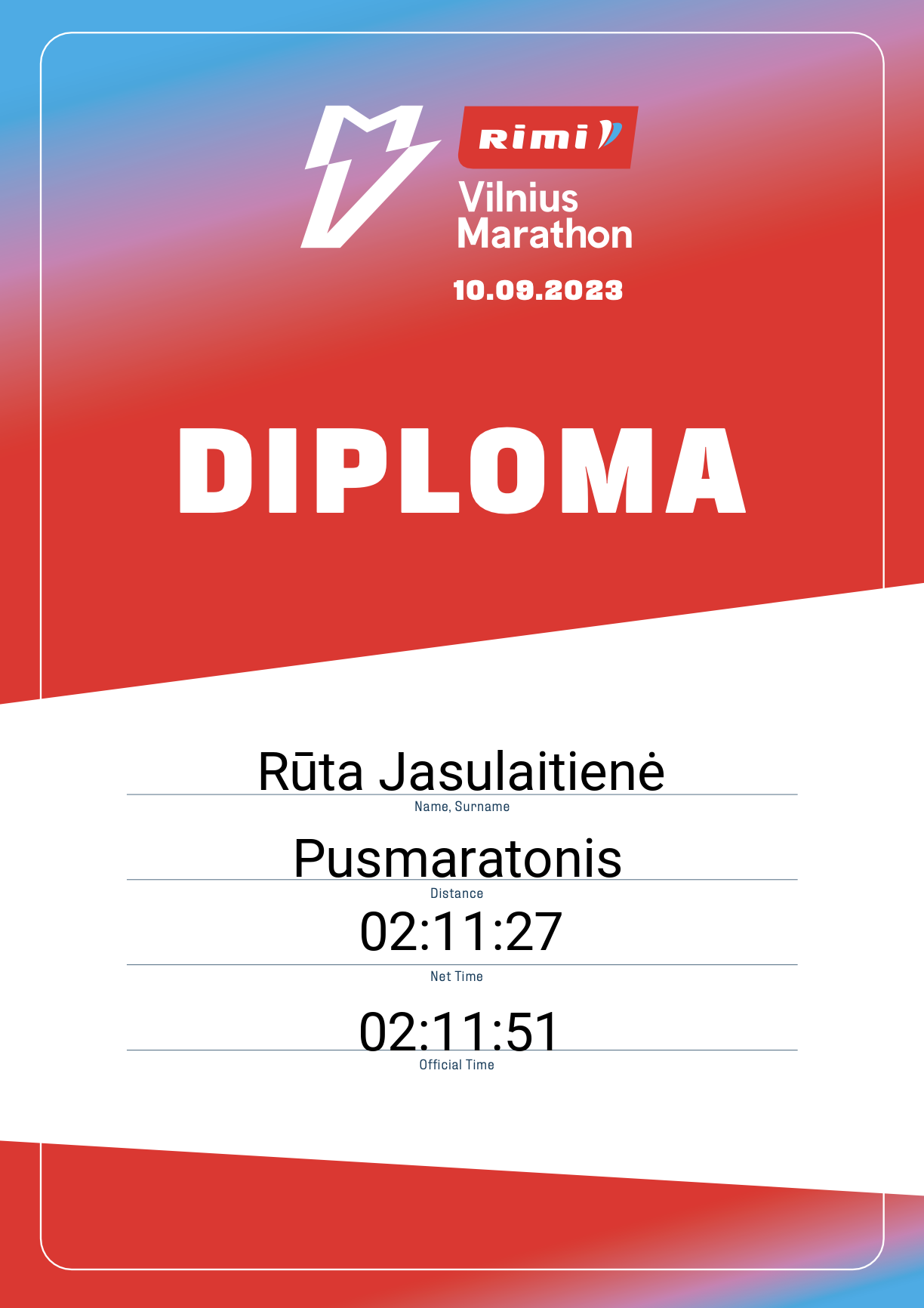 | 1316 | Rūta Jasulaitienė | 12486 | Lithuania | Pusmaratonis | 02:11:51 | Diplomas |