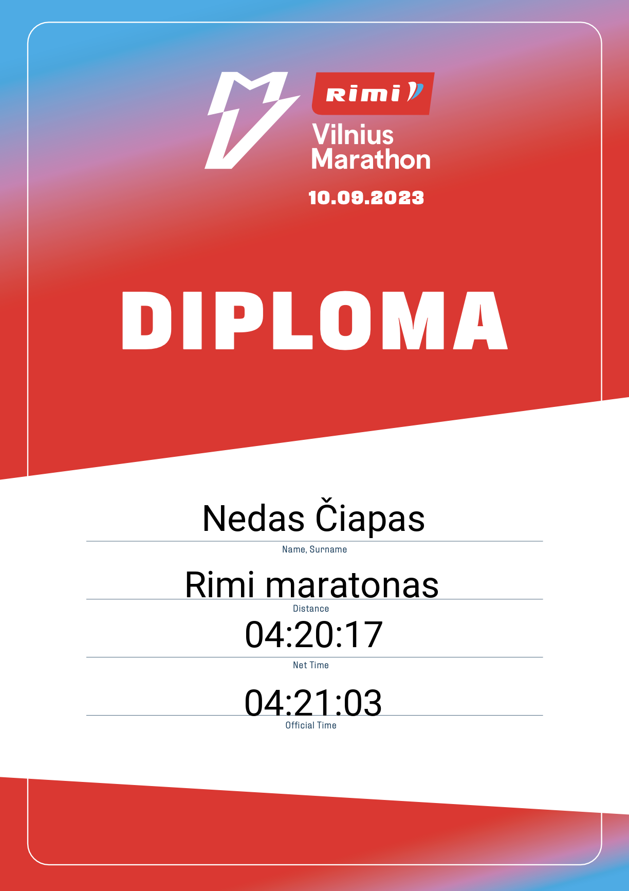 | 588 | Nedas Čiapas | 78 | Rimi maratonas | 04:21:03 | Diplomas | ||