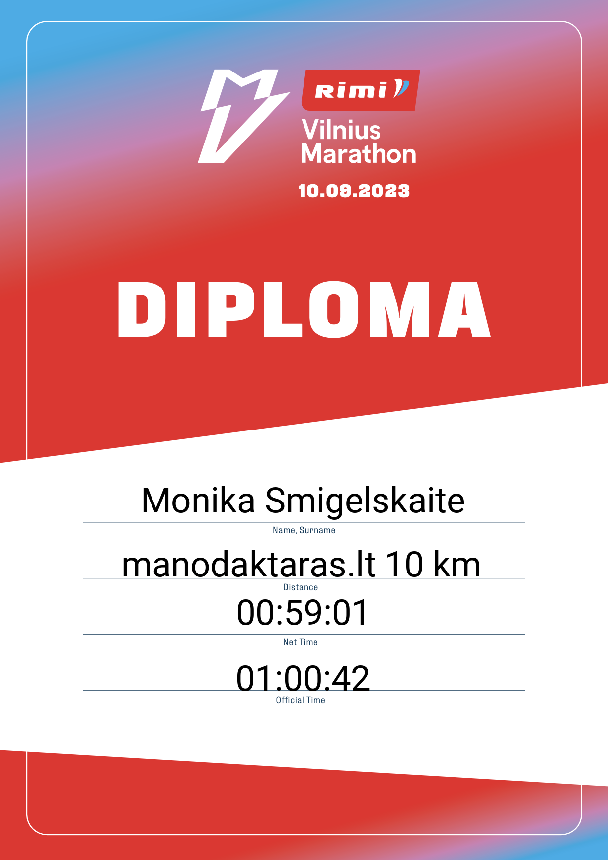 | 1073 | Monika Smigelskaite | 20752 | Lithuania | manodaktaras.lt 10 km | 01:00:42 | Diplomas | |