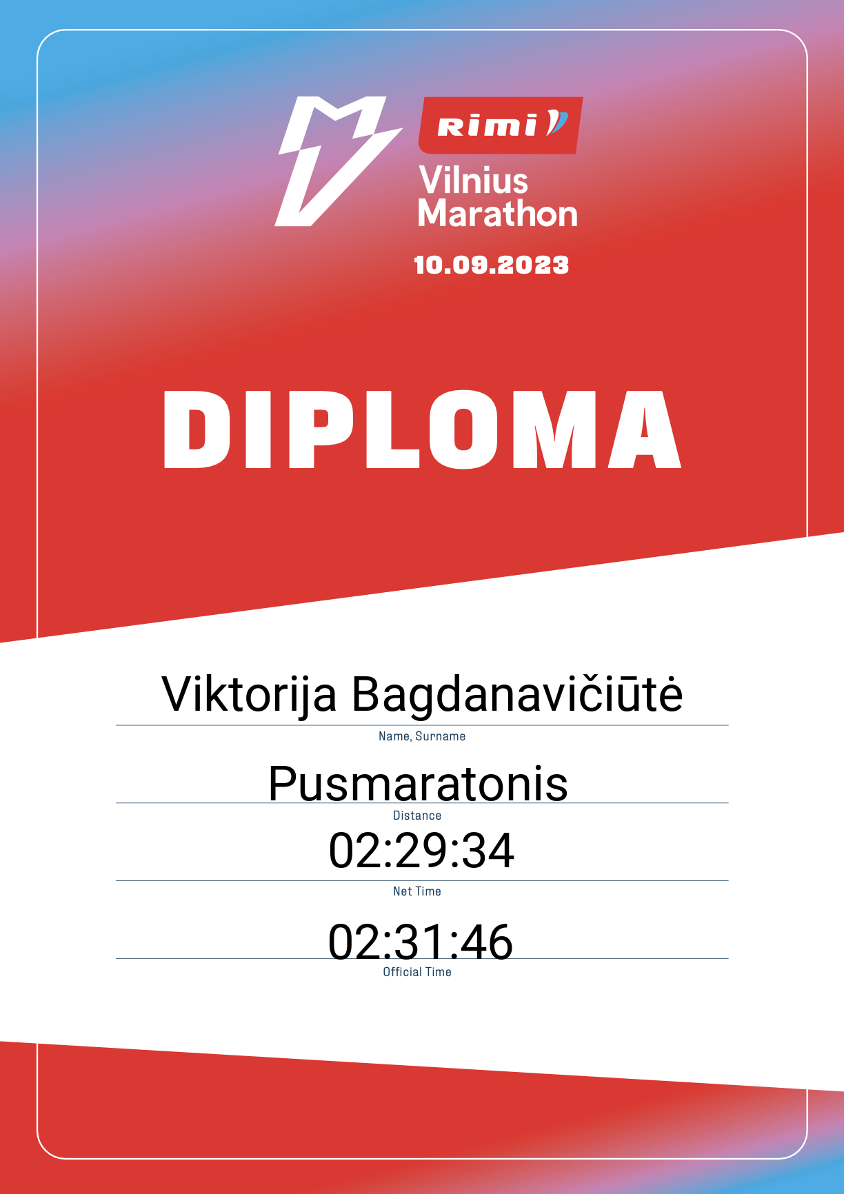 | 1622 | Viktorija Bagdanavičiūtė | 12923 | Lithuania | Pusmaratonis | 02:31:46 | Diplomas | |