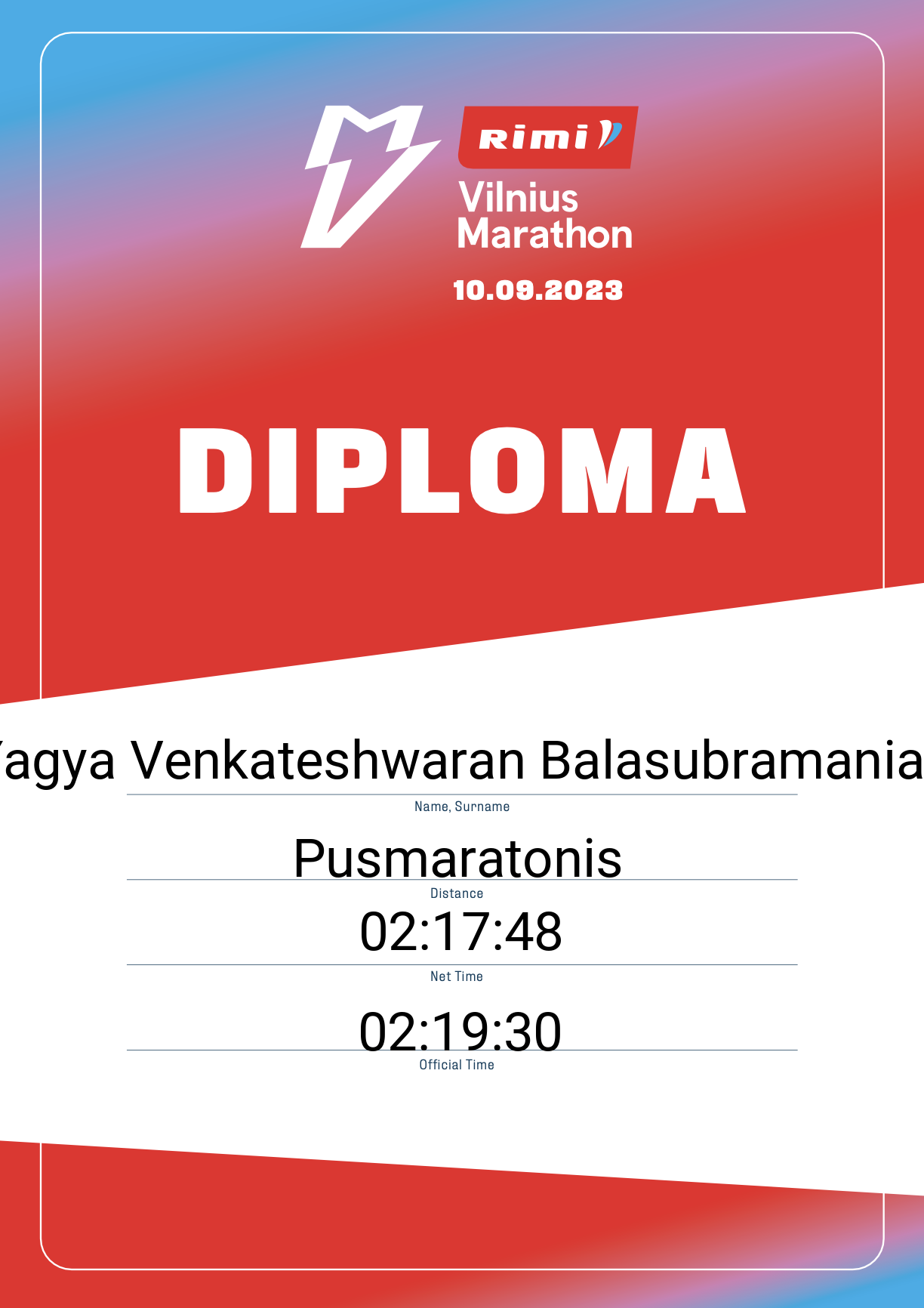 | 1476 | Yagya Venkateshwaran Balasubramanian | 14109 | Lithuania | Pusmaratonis | 02:19:30 | Diplomas | |