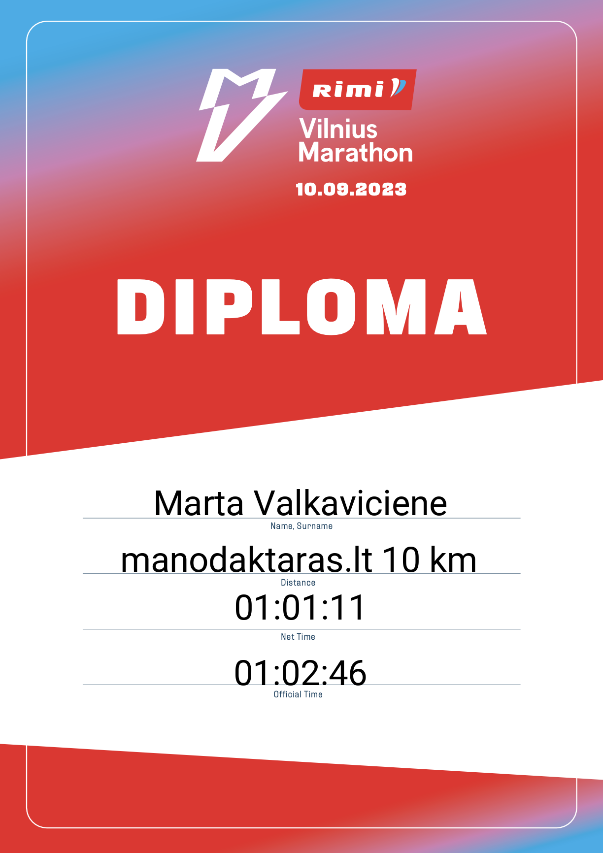 | 1205 | Marta Valkaviciene | 21986 | Lithuania | manodaktaras.lt 10 km | 01:02:46 | Diplomas | |