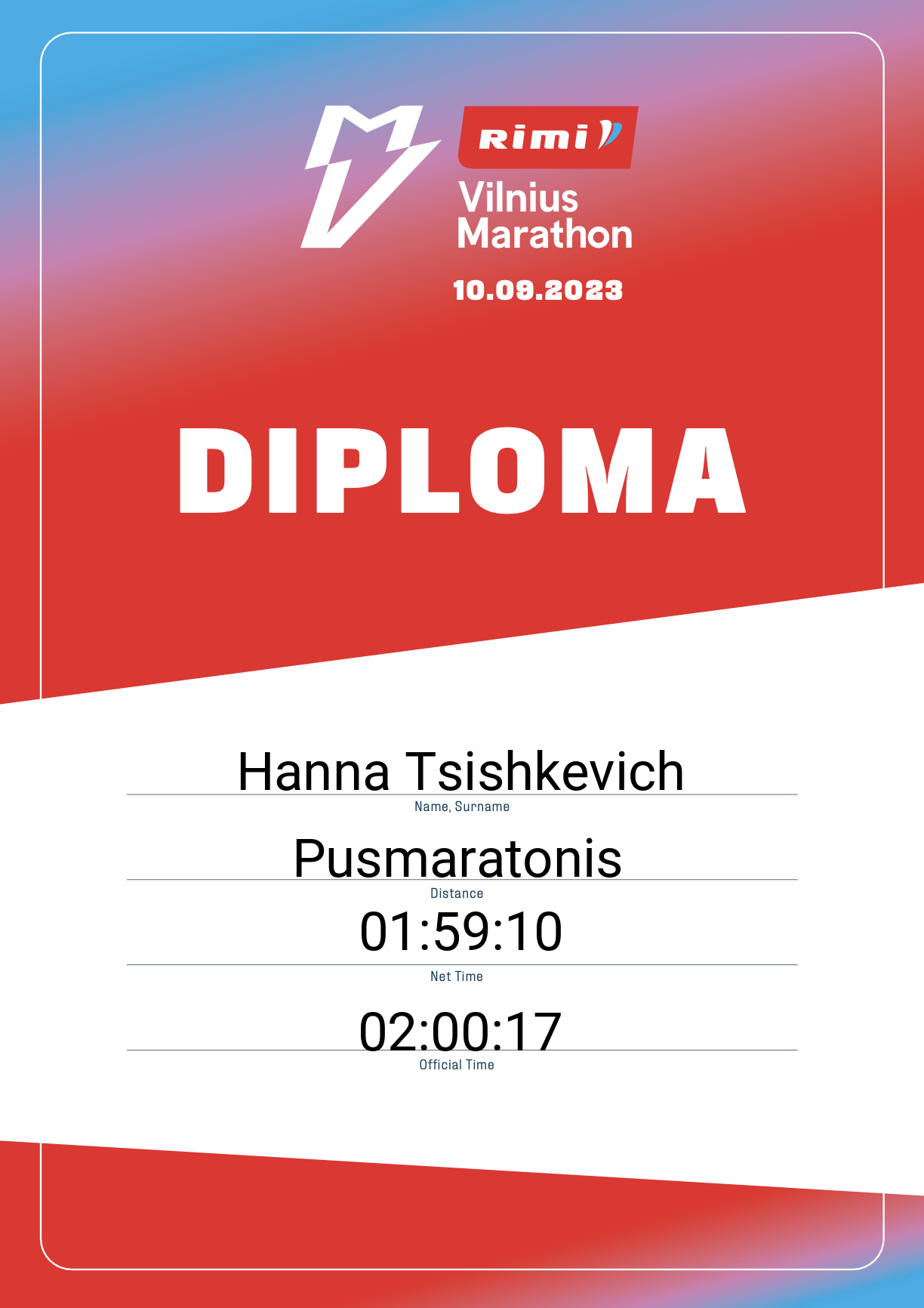 | 915 | Hanna Tsishkevich | 13529 | Lithuania | Pusmaratonis | 02:00:17 | Diplomas | |