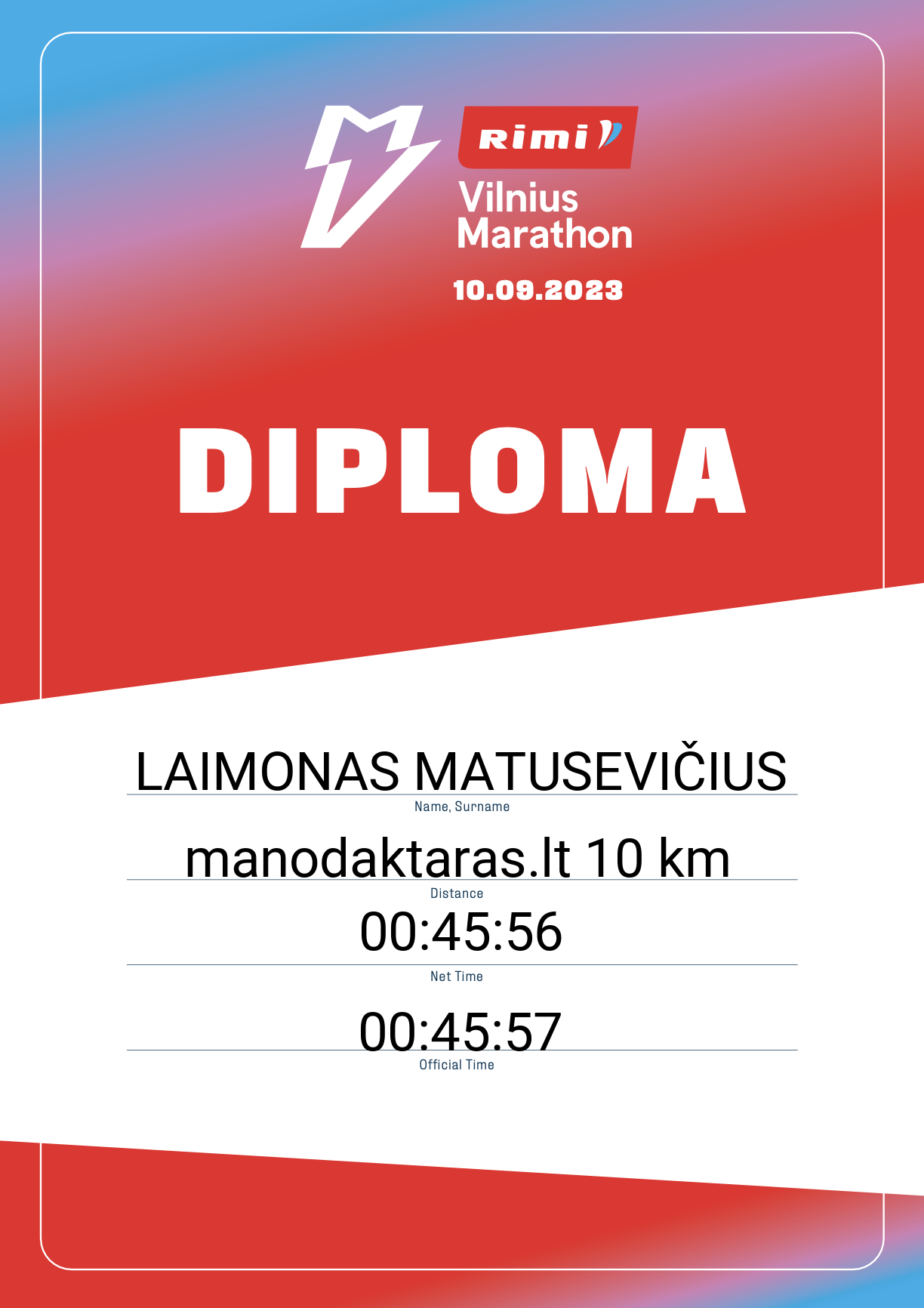 | 121 | LAIMONAS MATUSEVIČIUS | 20763 | Lithuania | manodaktaras.lt 10 km | 00:45:57 | Diplomas | |
