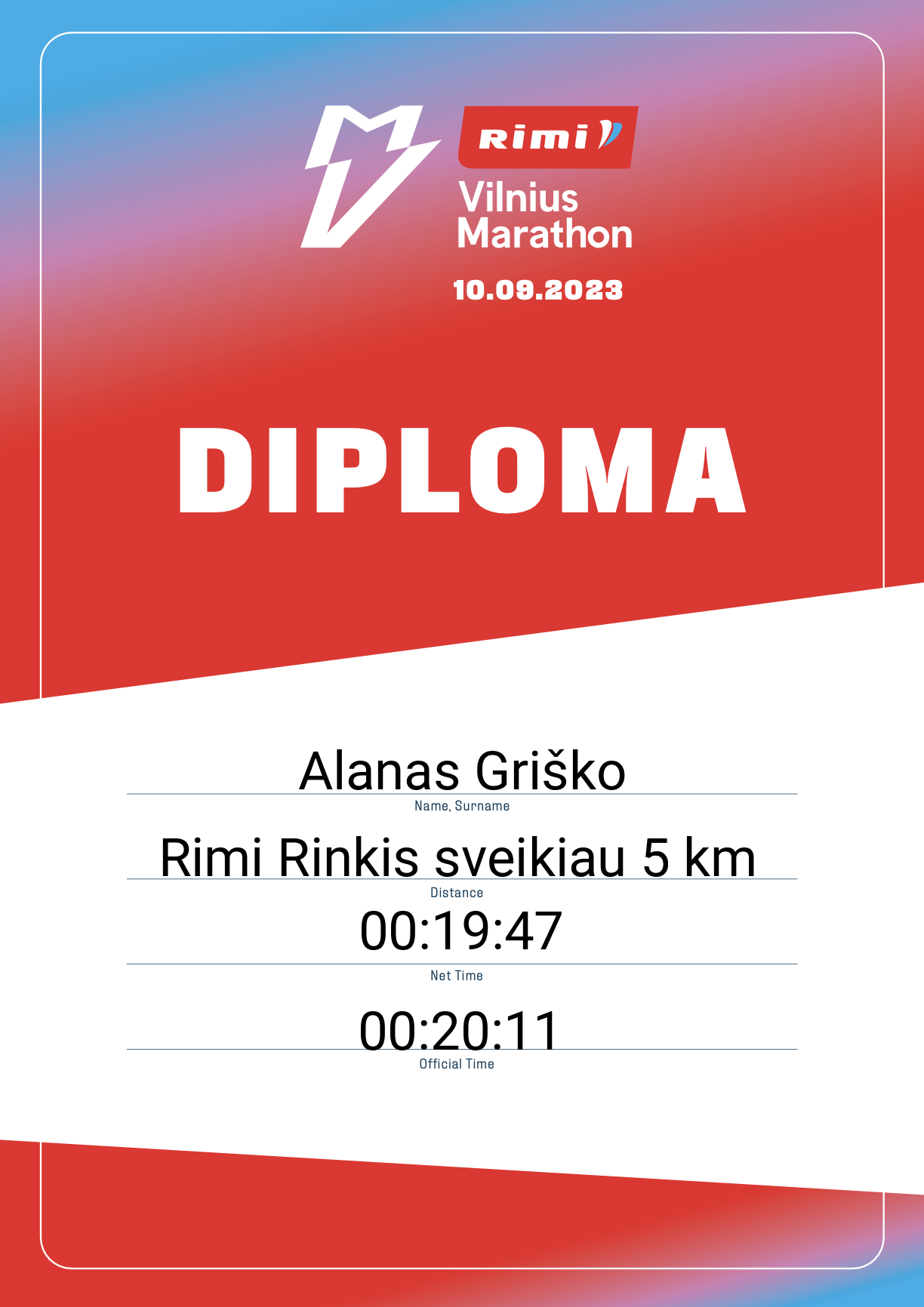 | 50 | Alanas Griško | SOSTINĖS SPORTO CENTRAS | 32733 | Lithuania | Rimi Rinkis sveikiau 5 km | 00:20:11 | Diplomas |