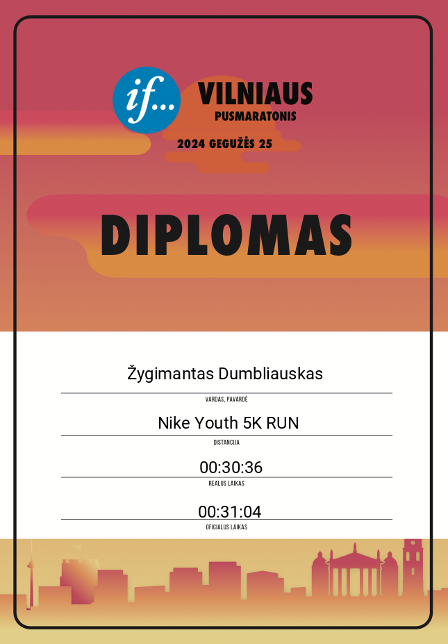| 304 | Žygimantas Dumbliauskas | Vilniaus paukštynas | 30266 | Lithuania | Nike Youth 5K RUN | 00:31:04 | Diplomas |