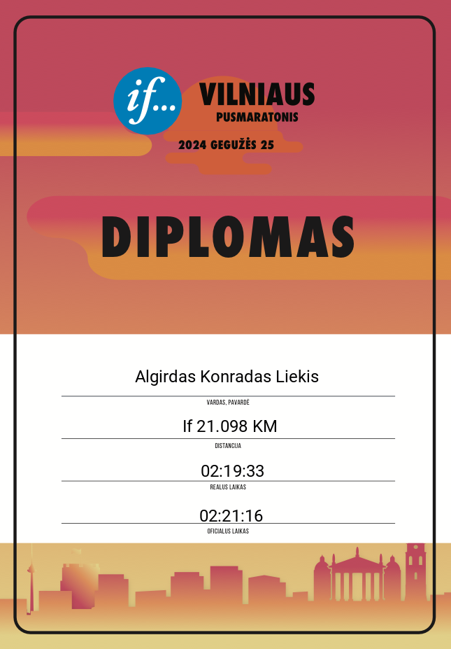| 212 | Algirdas Monkevičius | 40766 | Lithuania | 5K RUN | 00:30:17 | Diplomas | |