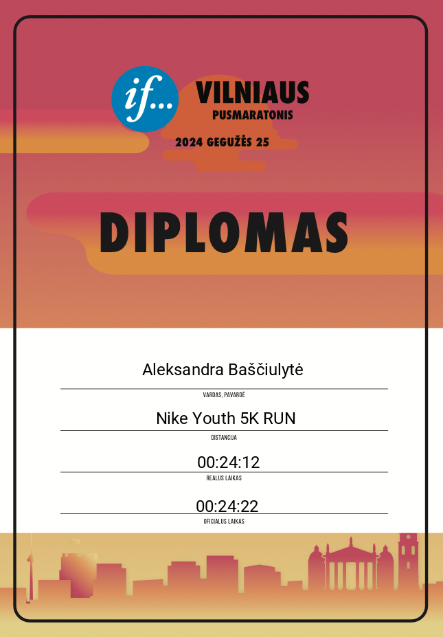 | 105 | Aleksandra Baščiulytė | Sostinės sporto centras | 30495 | Lithuania | Nike Youth 5K RUN | 00:24:22 | Diplomas |