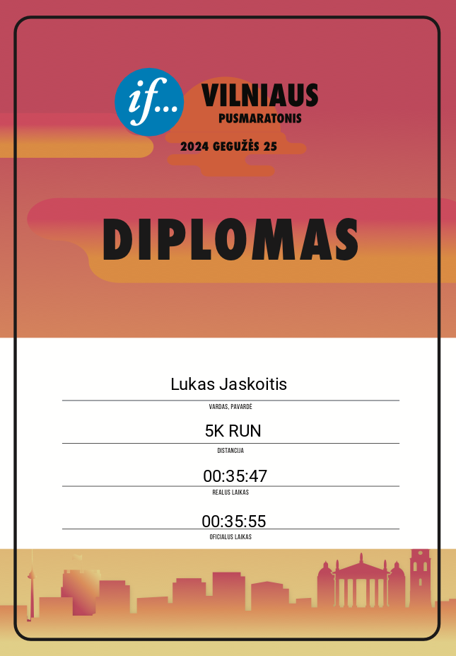 | 353 | Lukas Mališauskas | 40225 | Lithuania | 5K RUN | 00:33:36 | Diplomas | |
