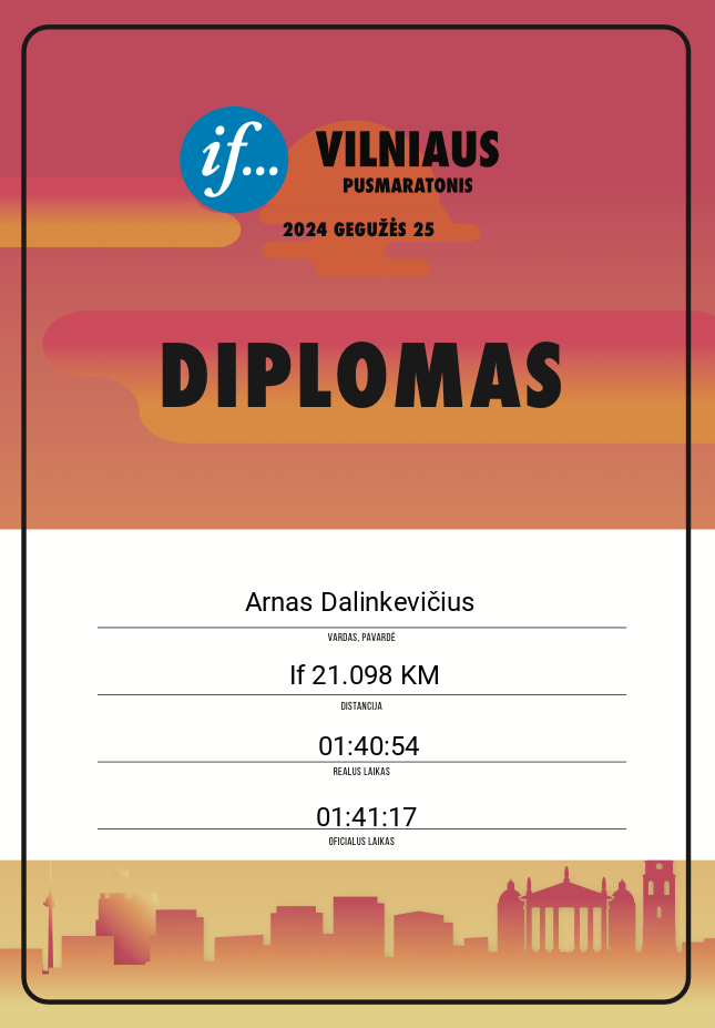244 Arnas Dalinkevičius 10190 Lithuania If 21.098 KM 01:41:17 01:40:54 00:25:15 00:49:02 01:05:48 01:13:30 Diplomas