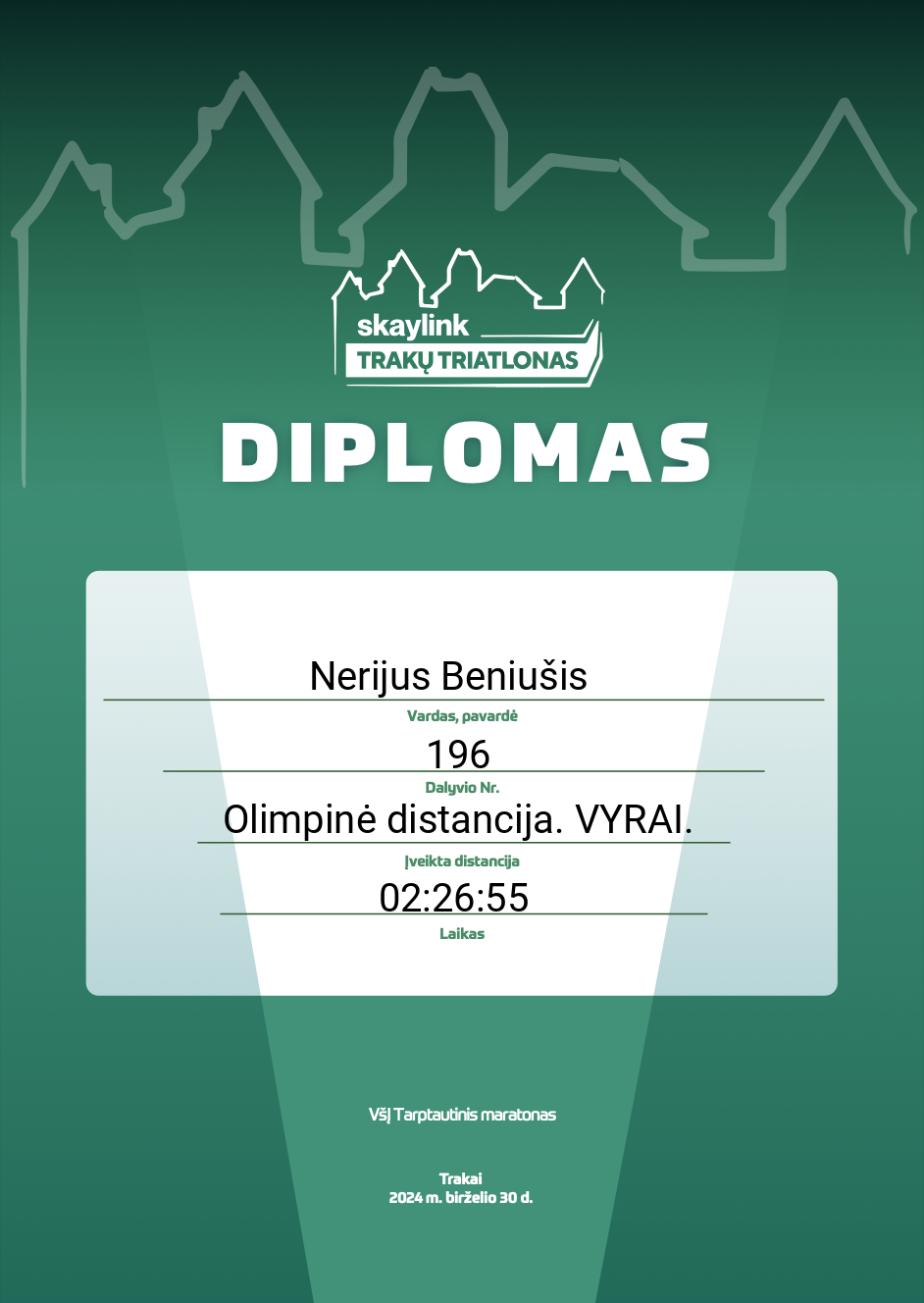 | 6 | Airidas Gražinskis | TRItonas | 195 | Lithuania | Olimpinė distancija. VYRAI. | 02:09:39 | Diplomas |