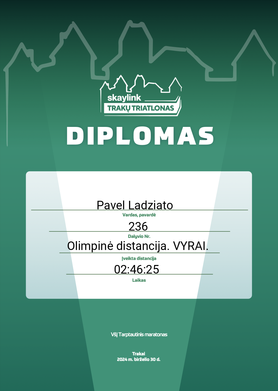 | 145 | Pavel Ladziato | Swedbank | 236 | Lithuania | Olimpinė distancija. VYRAI. | 02:46:25 | Diplomas |
