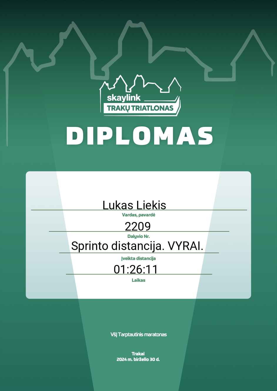 | 62 | Lukas Liekis | TEMPLE social club | 2209 | Lithuania | Sprinto distancija. VYRAI. | 01:26:11 | Diplomas |