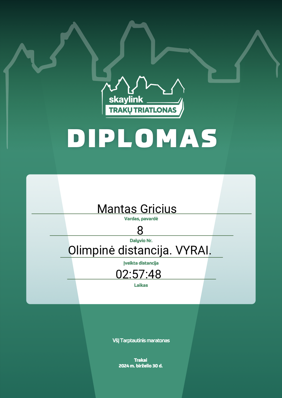 185 Mantas Gricius HighPeaks Lietuva 8 Lithuania Olimpinė distancija. VYRAI. 02:57:48 00:41:50 00:01:44 01:12:12 00:15:17 00:15:00 00:15:39 00:01:29 01:00:32 00:14:36 Diplomas