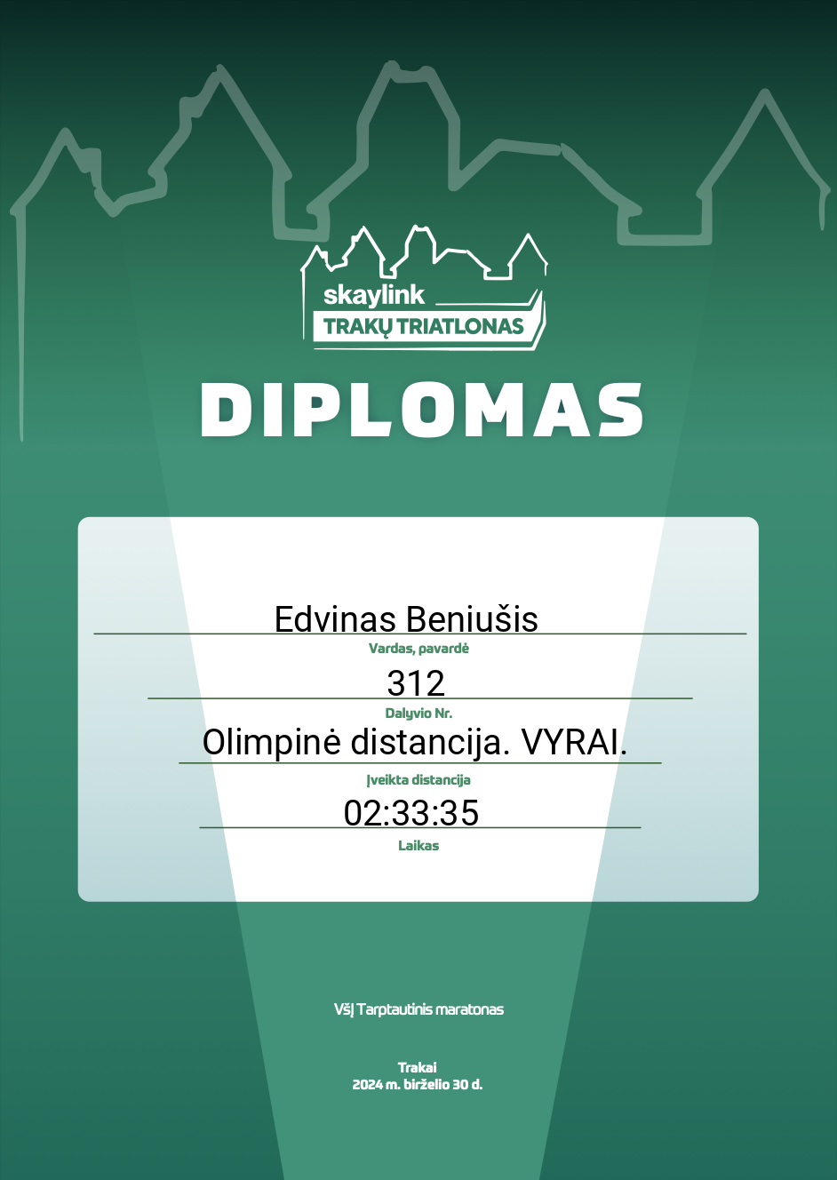 | 64 | Mintaras Grinius | 300 | Lithuania | Olimpinė distancija. VYRAI. | 02:30:48 | Diplomas | |