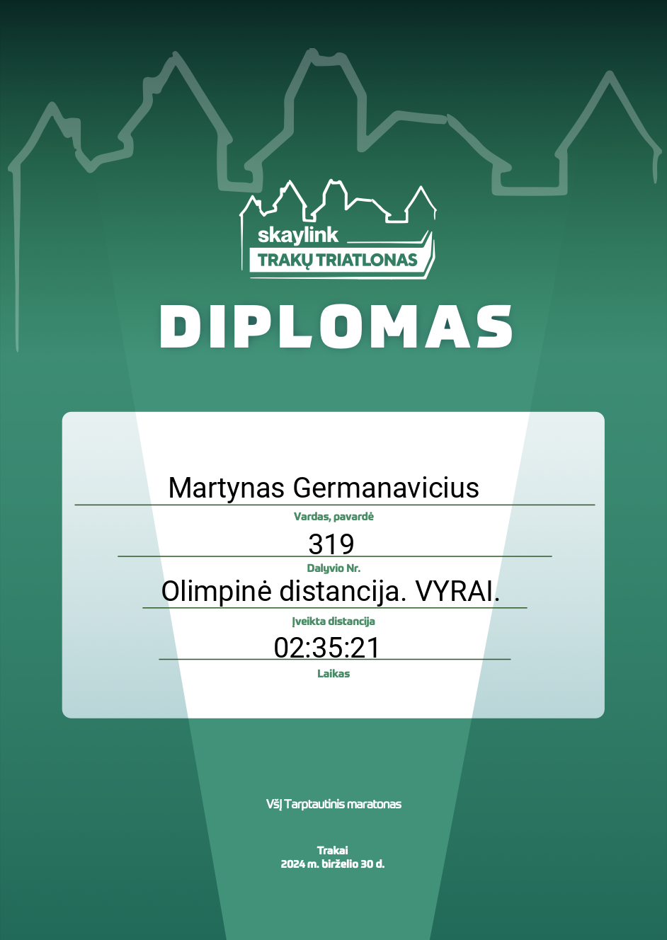 | 87 | Martynas Germanavicius | 319 | Lithuania | Olimpinė distancija. VYRAI. | 02:35:21 | Diplomas | |