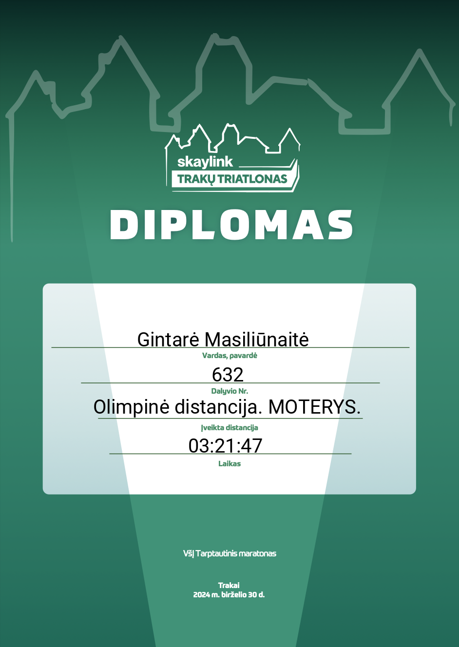 | 35 | Monika Žilienė | TSK "DARNA" ir LK KPKT Vilniaus RKPKS | 629 | Lithuania | Olimpinė distancija. MOTERYS. | 03:37:29 | Diplomas |