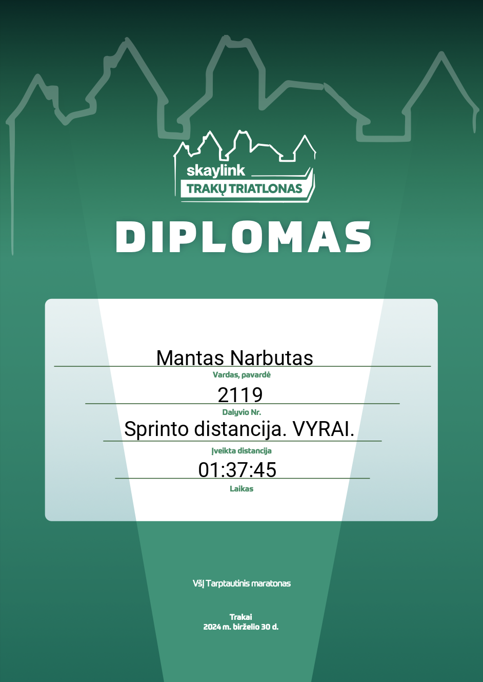 | 113 | Darius Aidietis | Focus running | 1 | Lithuania | Olimpinė distancija. VYRAI. | 02:40:37 | Diplomas |