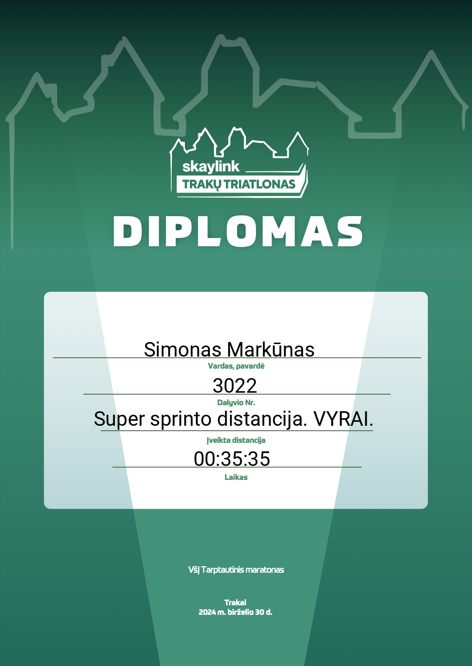 | 8 | Kristupas Jančius | Sostinės SC | 3032 | Lithuania | Super sprinto distancija. VYRAI. | 00:35:14 | Diplomas |