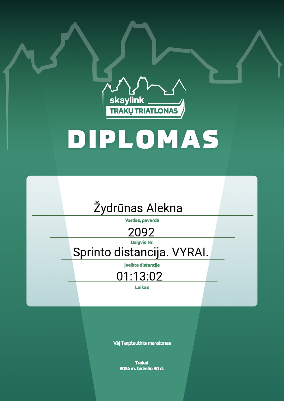 | 10 | Mantas Bartkus | Kauno Triatlono Klubas | 25 | Lithuania | Olimpinė distancija. VYRAI. | 02:12:21 | Diplomas |