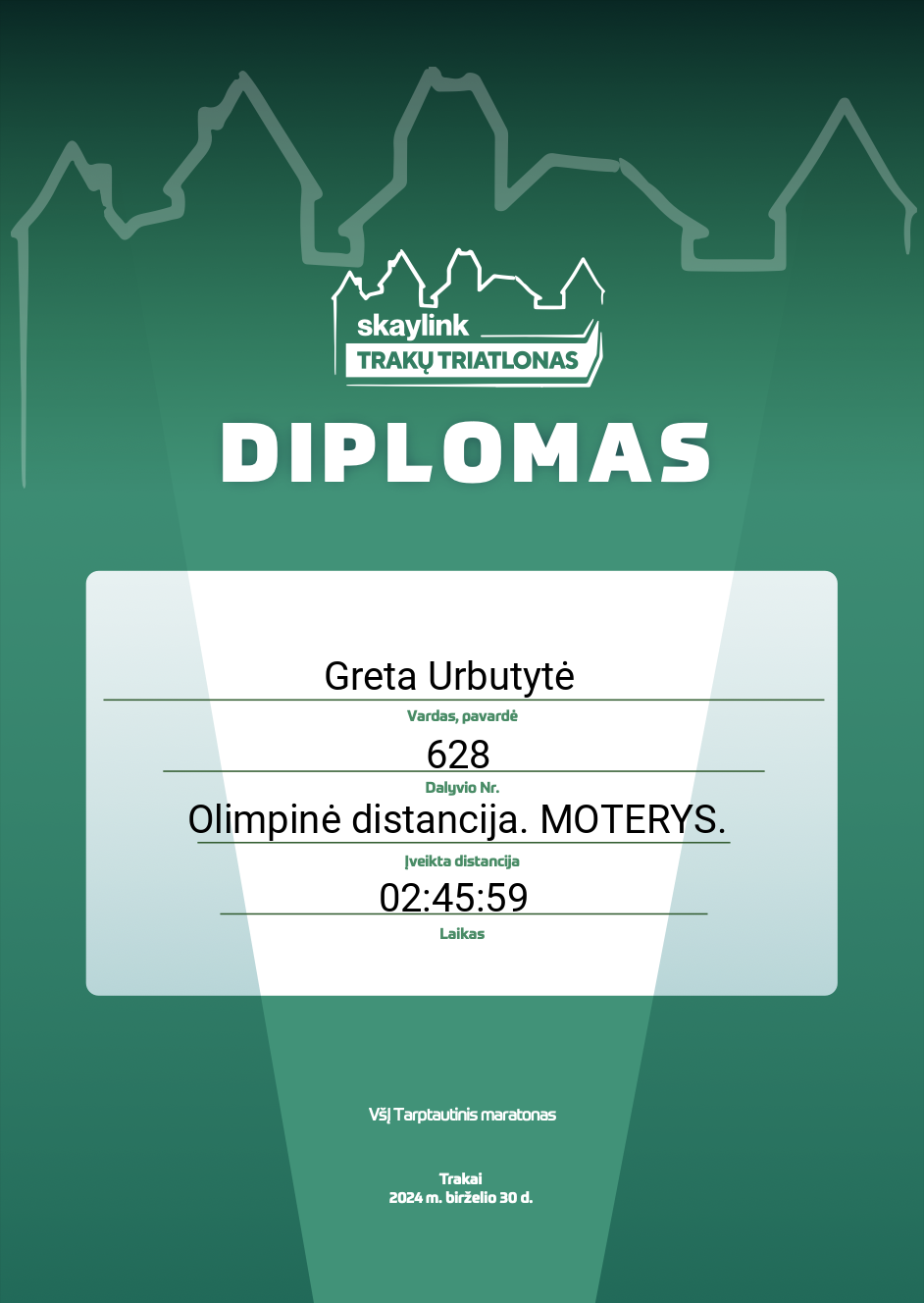 | 10 | Greta Urbutytė | Trakų Triatlono Būrelis | 628 | Lithuania | Olimpinė distancija. MOTERYS. | 02:45:59 | Diplomas |