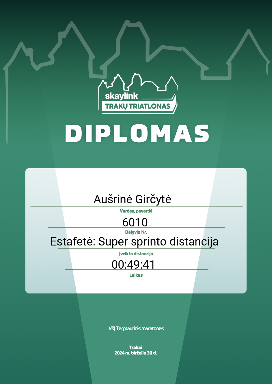 | 9 | Aušrinė Girčytė | Klaipėdos Triatlono klubas | 6010 | Lithuania | Estafetė: Super sprinto distancija | 00:49:41 | Diplomas |