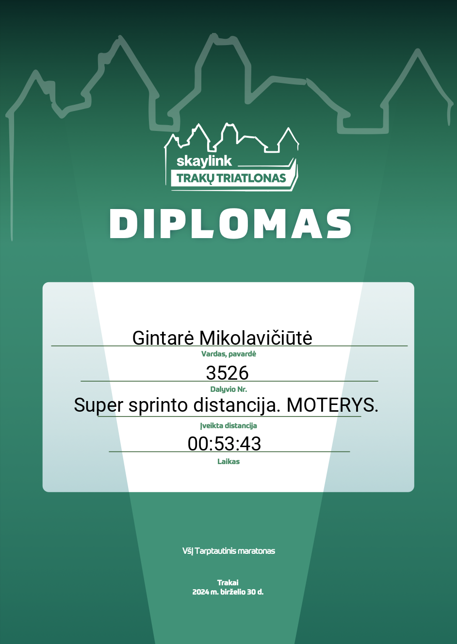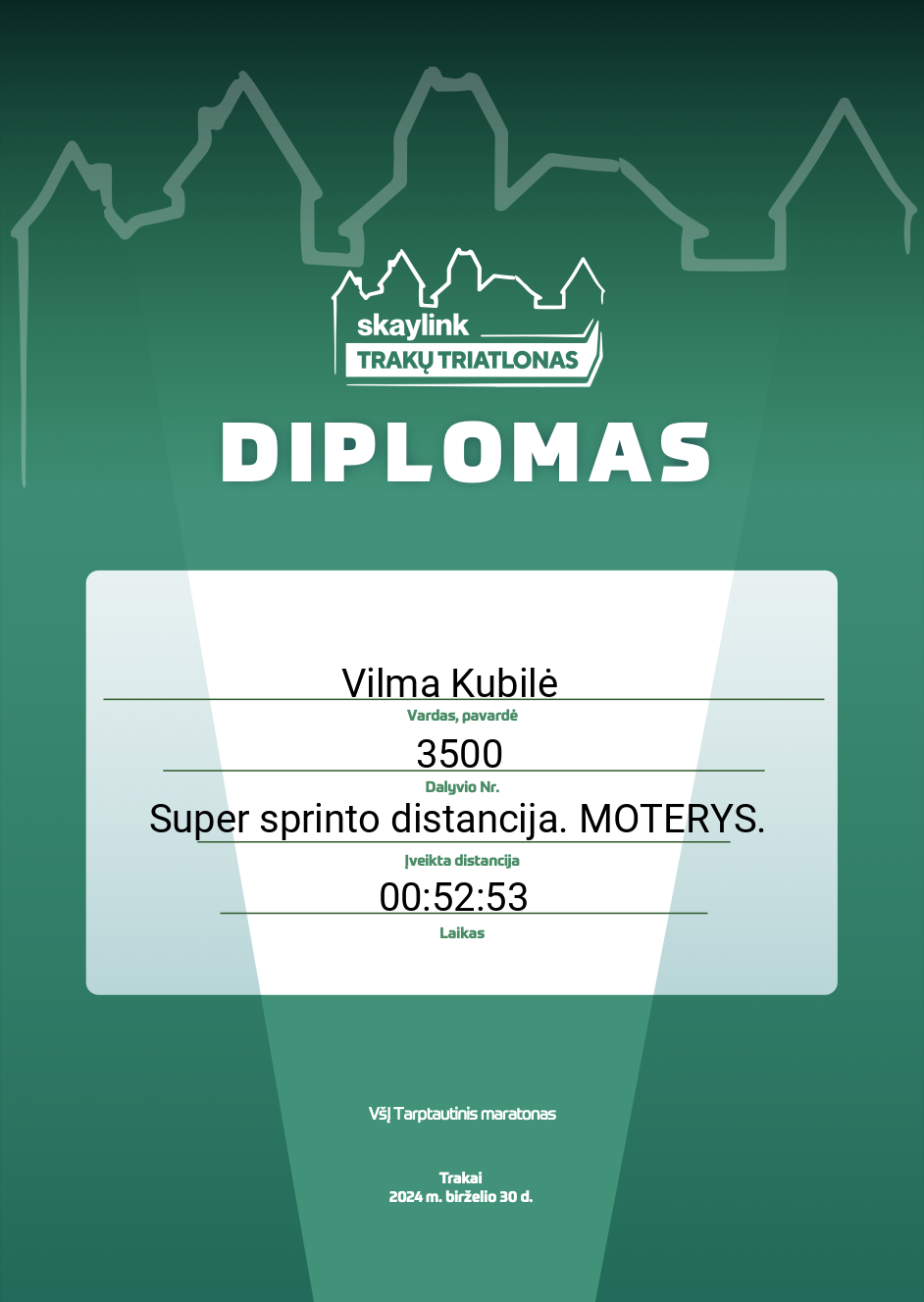 20 Vilma Kubilė TTB 3500 Lithuania Super sprinto distancija. MOTERYS. 00:52:53 00:11:11 00:01:16 00:24:27 00:01:00 00:14:59 Diplomas