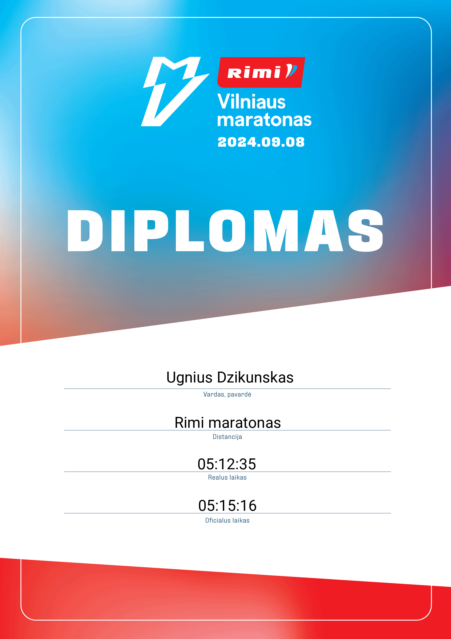 | 1117 | Ugnius Dzikunskas | 1156 | Lithuania | Rimi maratonas | 05:15:16 | Diplomas | |