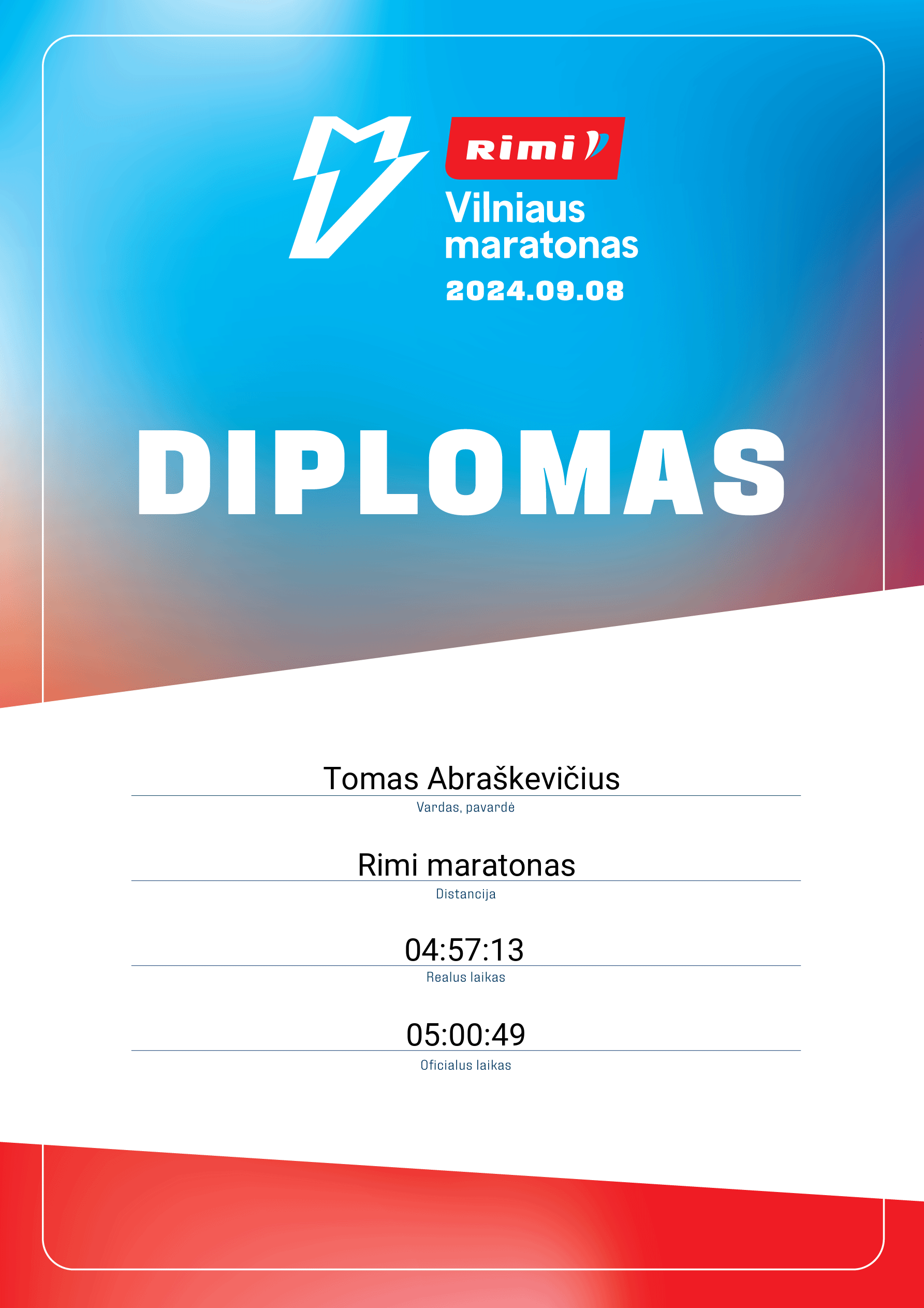 | 492 | Aurimas Čiuberkis | Love Streams Running | 167 | Lithuania | Rimi maratonas | 03:56:52 | Diplomas |