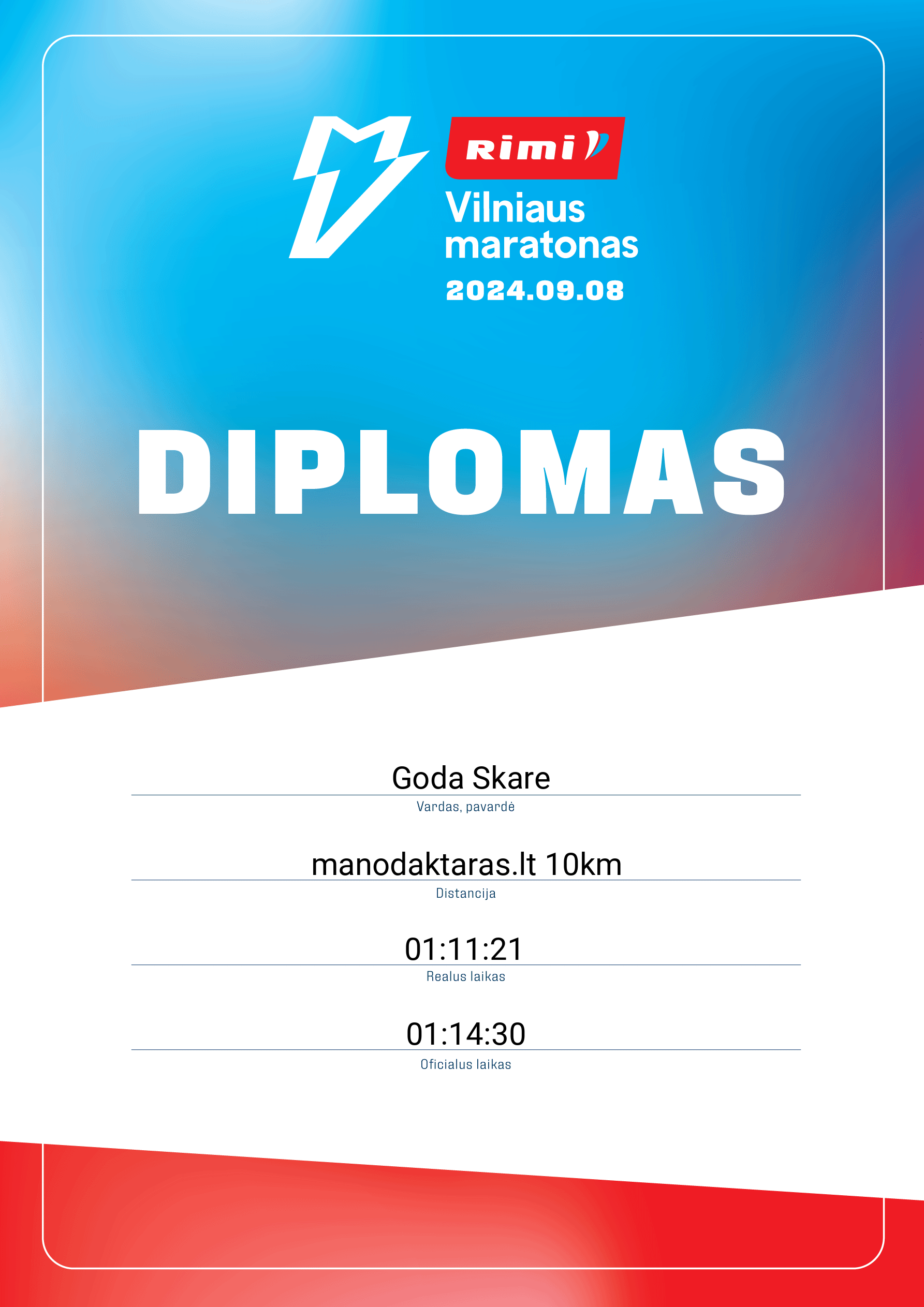 | 1487 | Ovidijus Mykolaitis | 20629 | Lithuania | manodaktaras.lt 10km | 01:06:08 | Diplomas | |