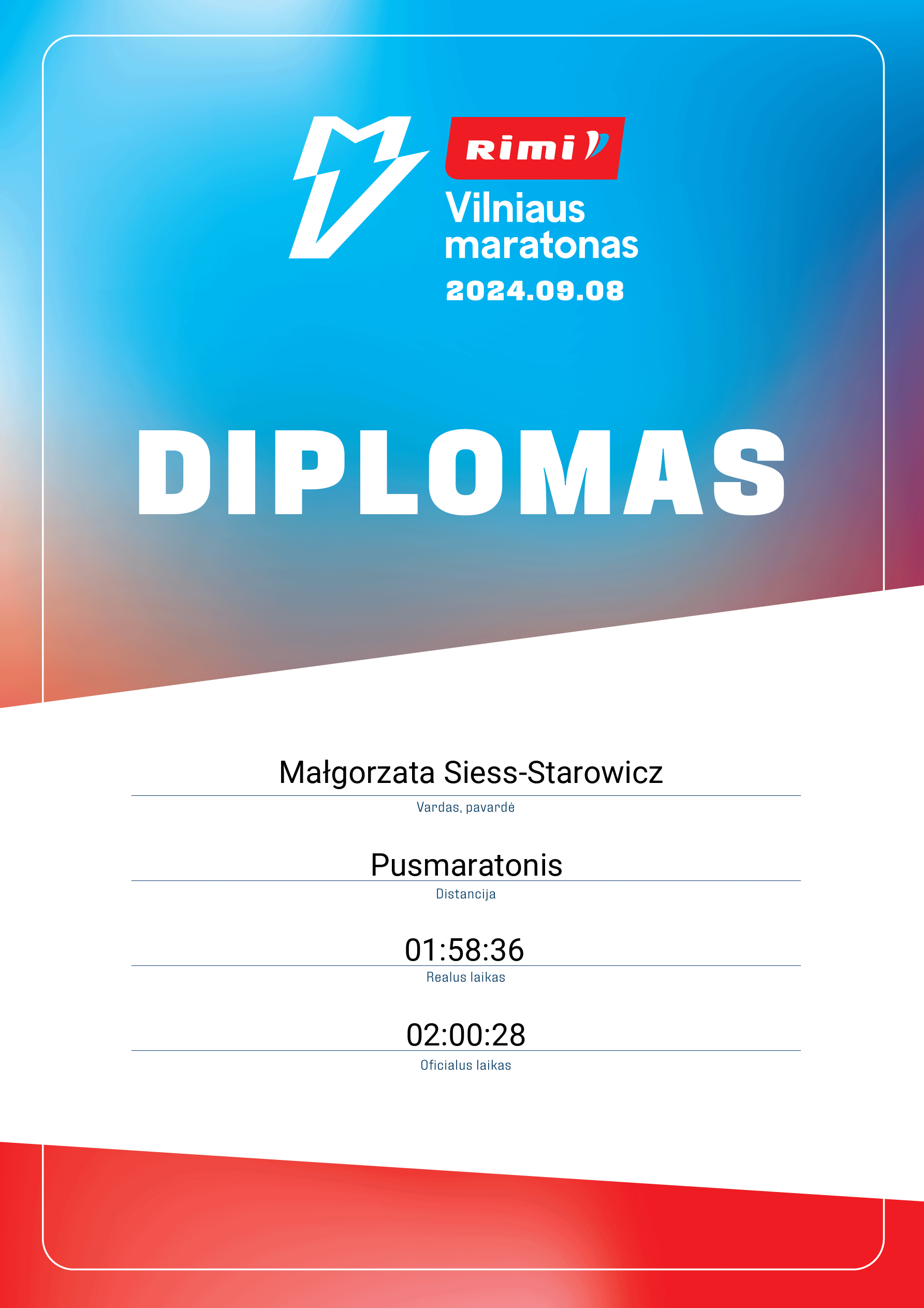 | 59 | Rolandas Vasiliauskas | Run | 10414 | Lithuania | Pusmaratonis | 01:24:37 | Diplomas |
