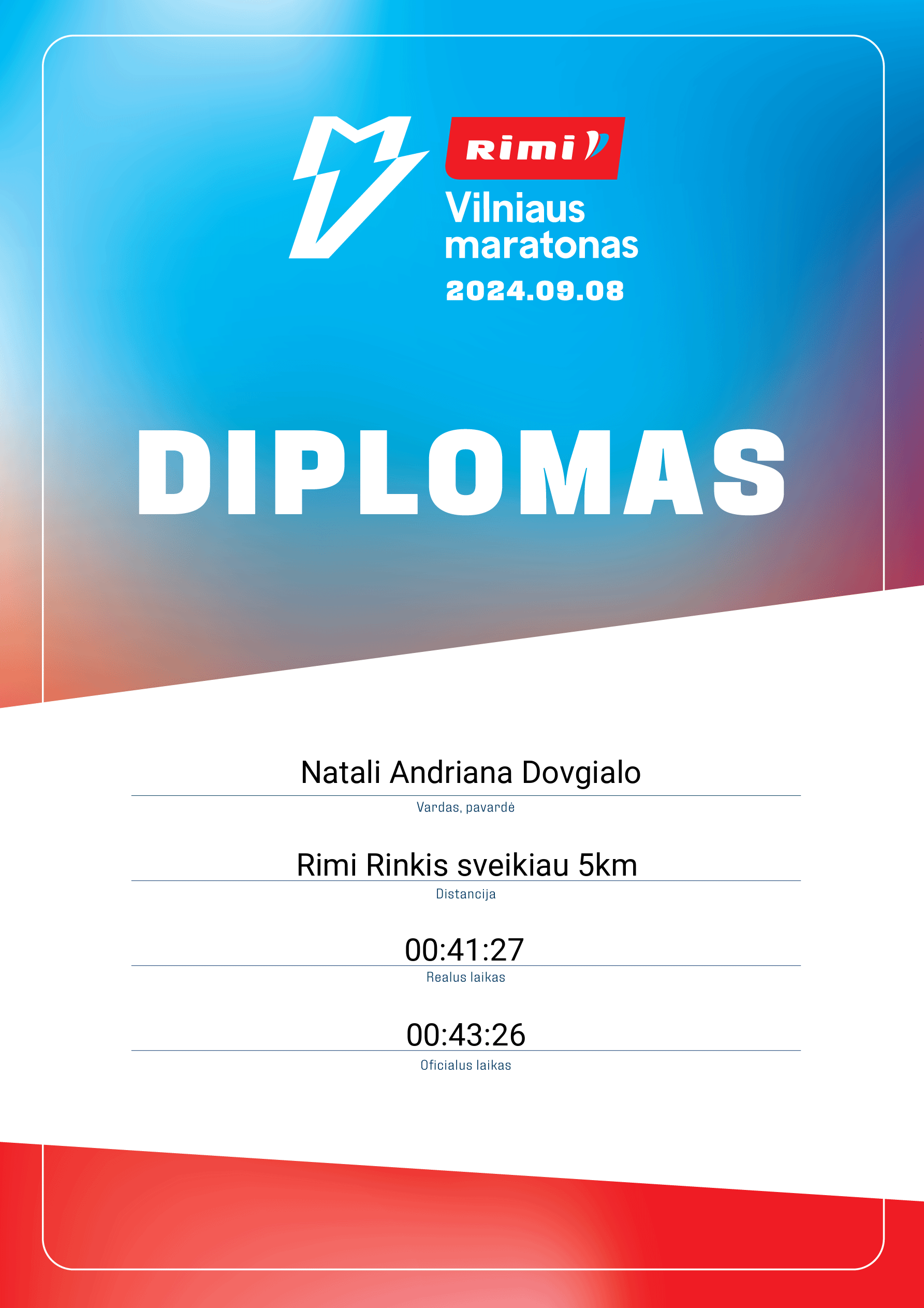 | 2458 | Natali Andriana Dovgialo | Erasmus+ | 33314 | Lithuania | Rimi Rinkis sveikiau 5km | 00:43:26 | Diplomas |