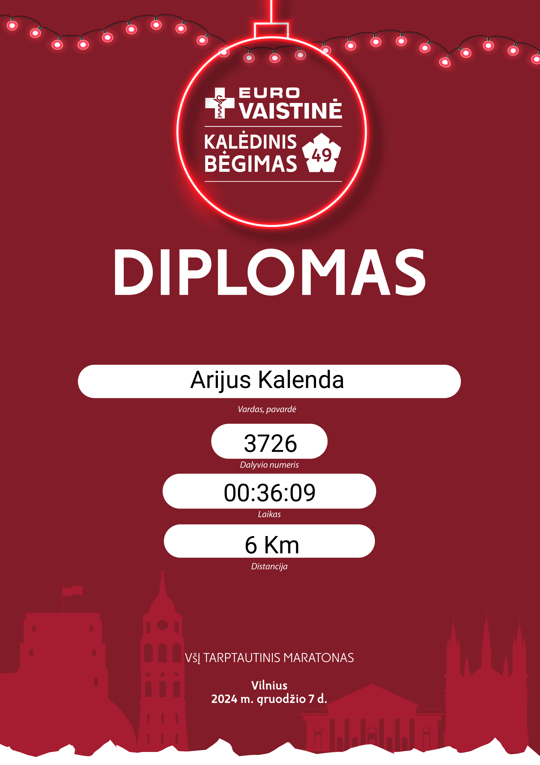| 204 | Arnas Vyšniauskas | Sesės bėga | 3629 | Lithuania | 6 Km | 00:32:40 | Diplomas |
