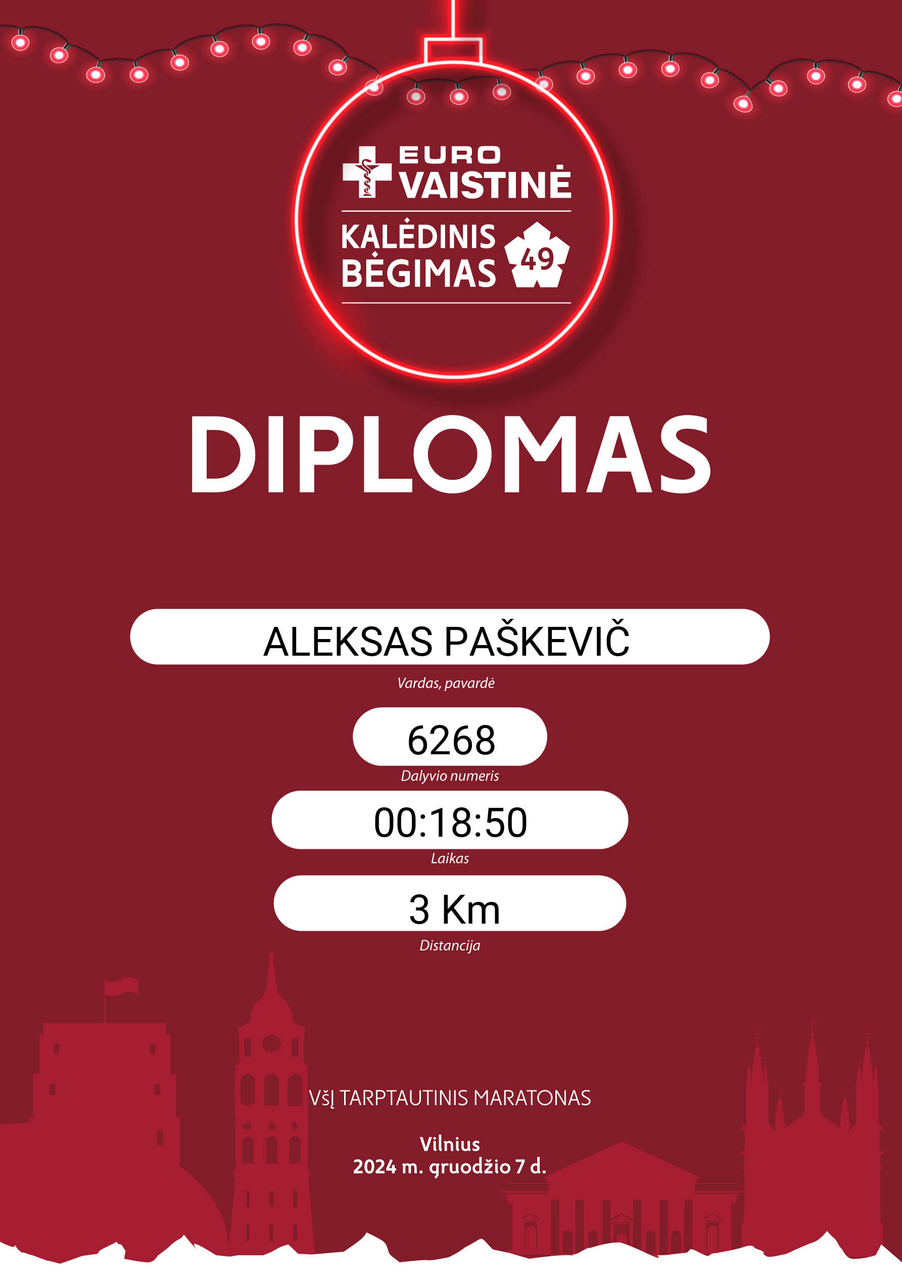 | 210 | ALEKSAS PAŠKEVIČ | 6268 | Lithuania | 3 Km | 00:18:50 | Diplomas | |