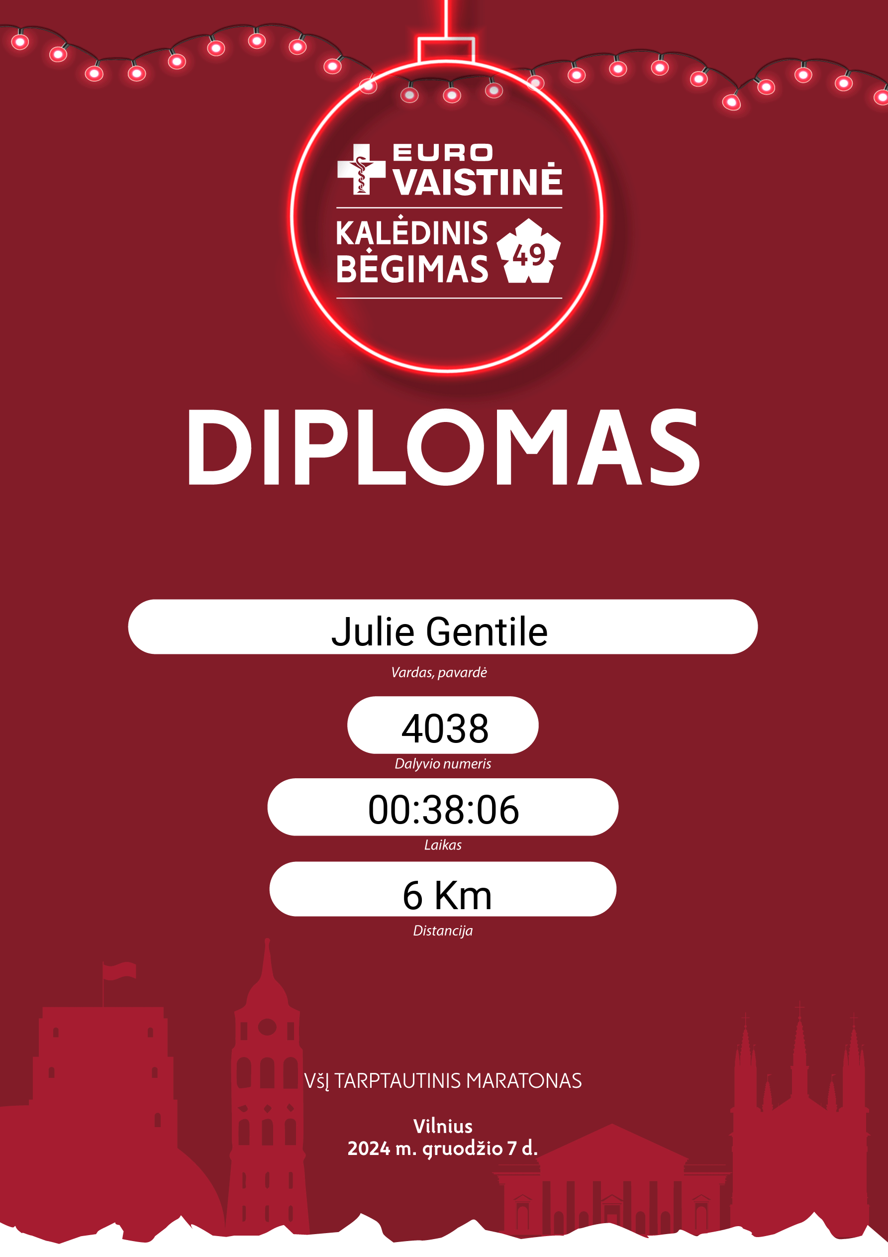 | 658 | Julita Kvedaraitė | 4044 | Lithuania | 6 Km | 00:41:06 | Diplomas | |
