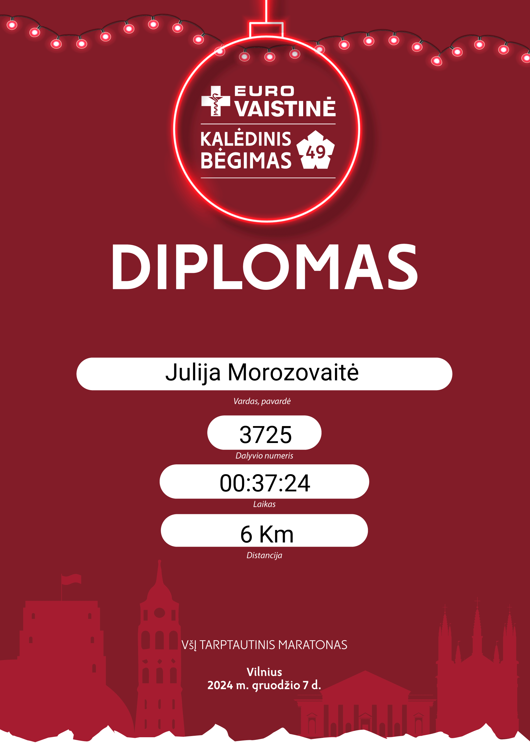 | 432 | Julija Morozovaitė | 3725 | Lithuania | 6 Km | 00:37:24 | Diplomas | |