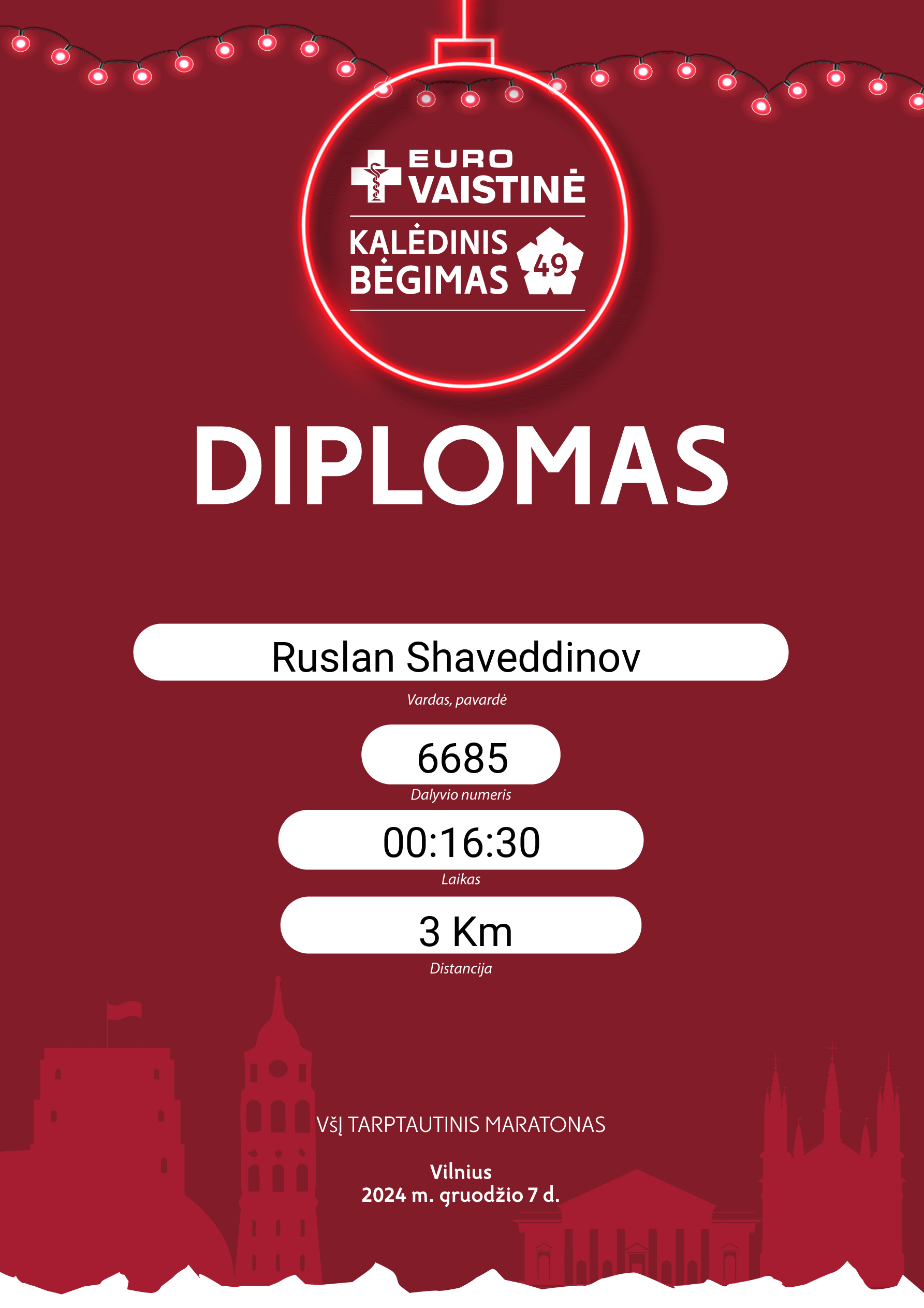 | 113 | Ruslan Shaveddinov | 6685 | Lithuania | 3 Km | 00:16:30 | Diplomas | |