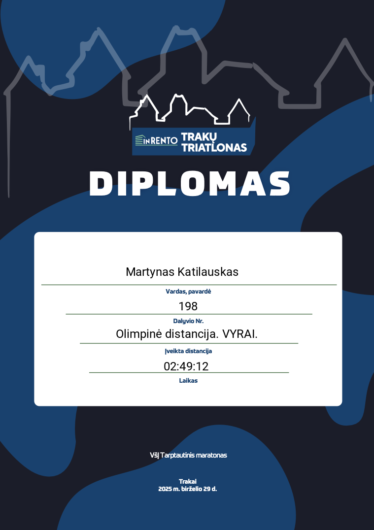 | 162 | Martynas Katilauskas | 198 | Lithuania | Olimpinė distancija. VYRAI. | 02:49:12 | Diplomas | |