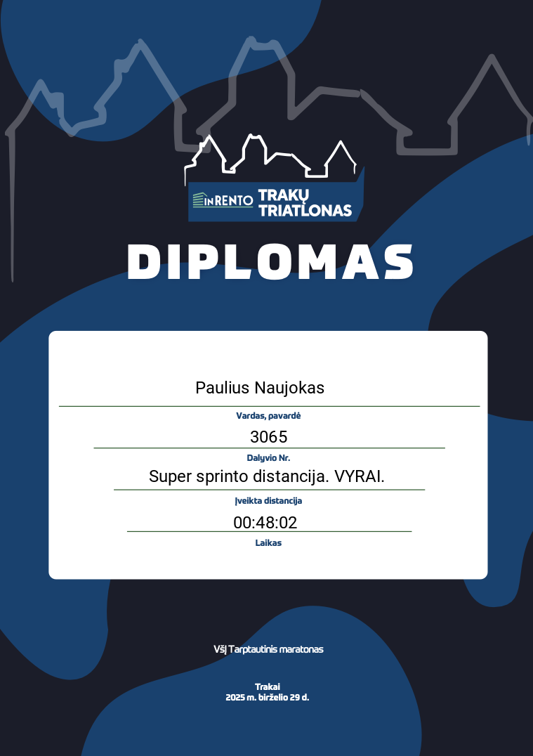 | 24 | Paulius Naujokas | Klaipėdos Triatlono Klubas | 3065 | Lithuania | Super sprinto distancija. VYRAI. | 00:48:02 | Diplomas |
