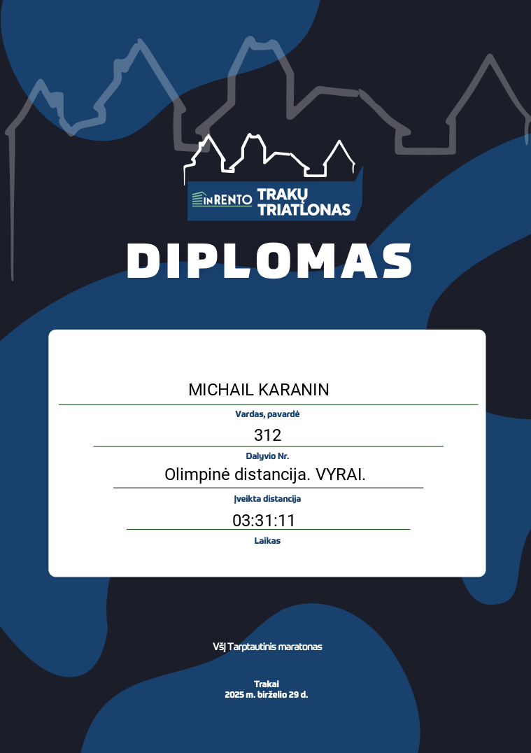 219 Andrejus Mejus TRAKU TRIATLONO BURELIS 303 Lithuania Olimpinė distancija. VYRAI. 03:13:26 00:36:10 00:05:04 01:24:57 00:15:31 00:15:15 00:15:28 00:03:33 01:03:42 00:17:27 Diplomas