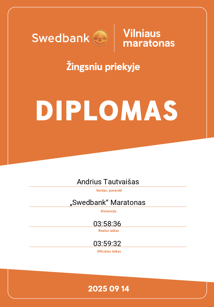| 674 | Andrius Tautvaišas | 522 | Lithuania | „Swedbank“ Maratonas | 03:59:32 | Diplomas | |