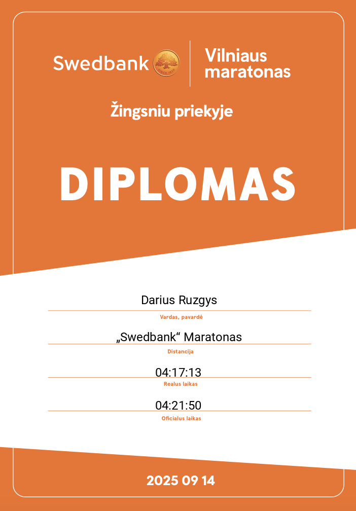 | 1013 | Darius Ruzgys | 621 | Lithuania | „Swedbank“ Maratonas | 04:21:50 | Diplomas | |