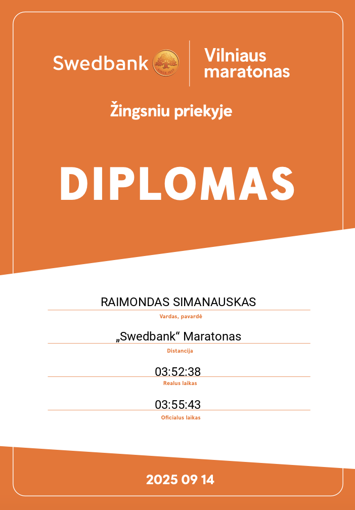 | 603 | RAIMONDAS SIMANAUSKAS | 1517 | Lithuania | „Swedbank“ Maratonas | 03:55:43 | Diplomas | |