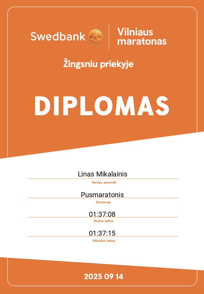 | 259 | Linas Mikalainis | Love Streams Running | 12048 | Lithuania | Pusmaratonis | 01:37:15 | Diplomas |